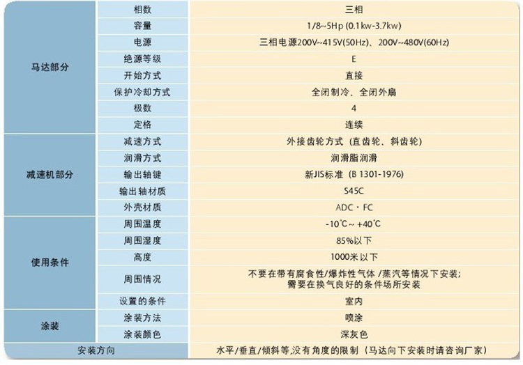 3) 全機(jī)種采用潤(rùn)滑脂潤(rùn)滑,因此減速機(jī)的安裝方向可自由選擇